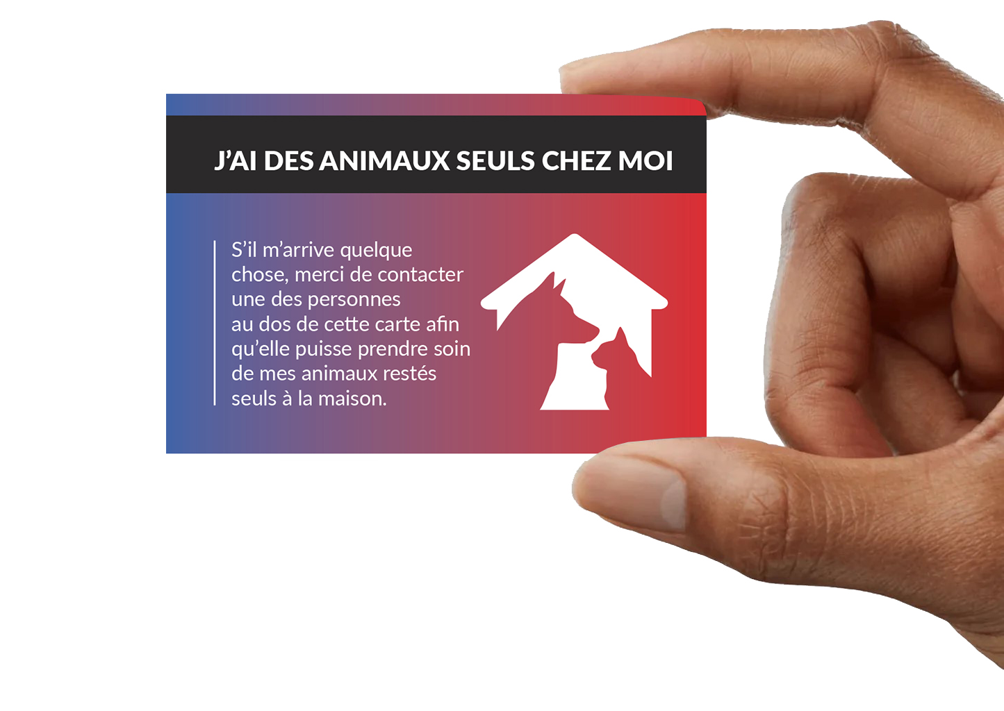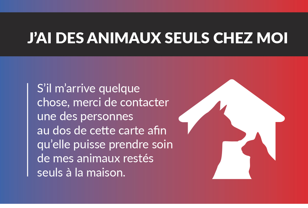Cette carte SOS à destination des propriétaires d’animaux a été conçue pour permettre de prévenir toute personne qui pourrait vous donner secours, qu’un animal vous attend à la maison et qu’il est seul.